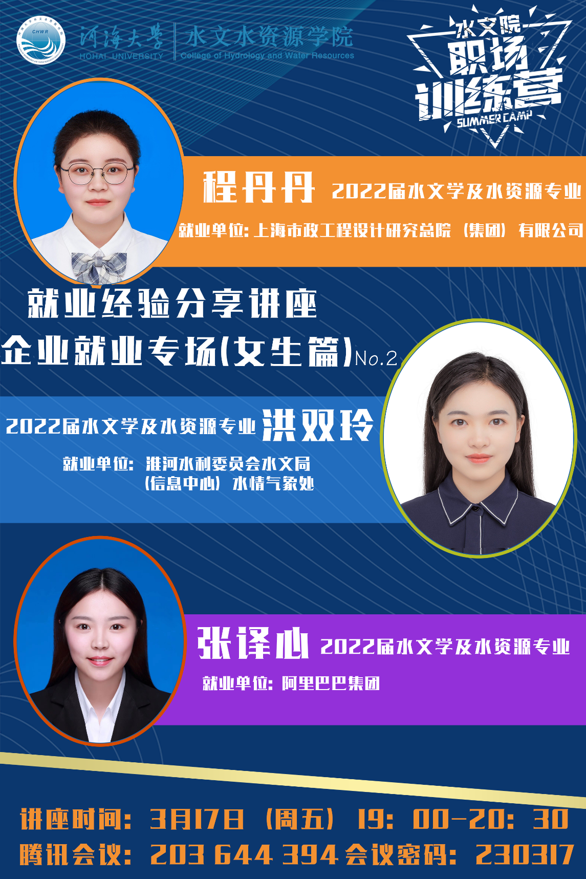 阳春三月,又是新一轮春招来到。为精准高效做好指导服务,扎实开展就业帮扶,提高女生就业成功率,3月17日,国产自拍 开展了第四期职场训练营活动,邀请2022届水文学及水资源专业程丹丹、洪双玲及张译心三位优秀女毕业生分享企业校招就业经验。本次活动由研究生辅导员林彦老师主持。