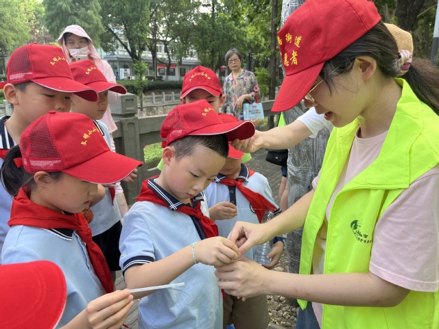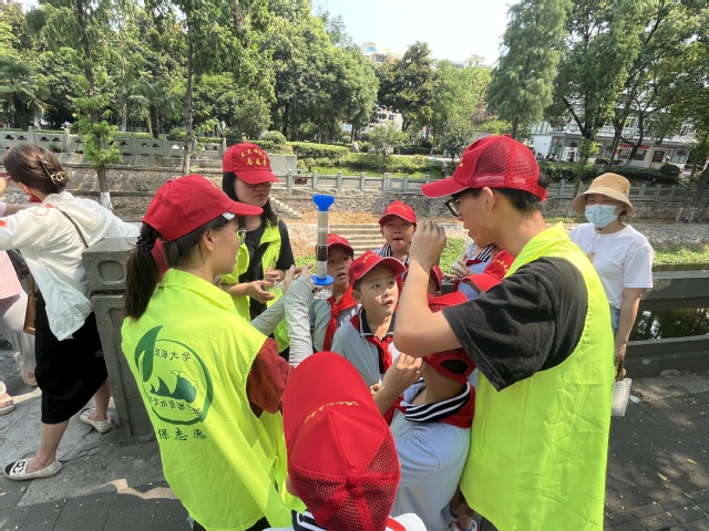 夏日炎炎,也挡不住小朋友们参与亲手检测身边河道水质的热情。在志愿者们的指导下,一行人来到了明御河进行了河水采样。志愿者们向小朋友分发了试纸,让小朋友们感受检测河水酸碱度的过程。通过简易滤水装置,让小朋友们体会滤水实验。小朋友们认真听、仔细看、用心思考,提出了许多关于水的问题,从健康饮水、到观察排污口,志愿者们详细讲解,也在小朋友心中种下了爱水、护水的种子。