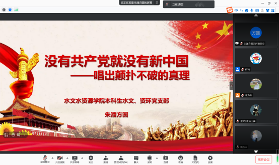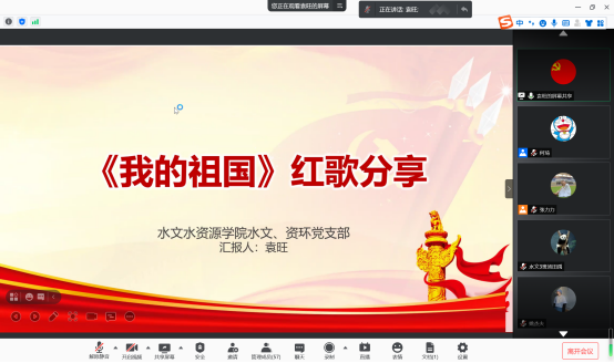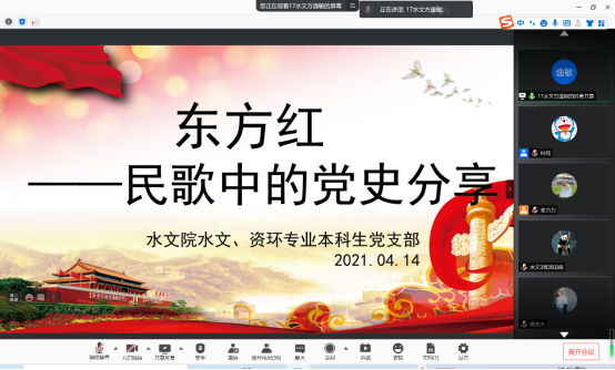 2021年4月14日晚七点半,国产自拍 水文、资环专业本科生党支部“民歌中的党史” 音诗画分享会主题党日活动如期开展,支部书记张力力同志主持了本次分享会,支部全体党员同志参与本次主题党日活动。