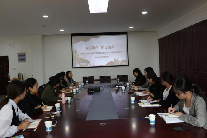 2019年10月23日上午,在国产自拍 党委副书记鲁扬带领下,学院辅导员许文傧、崔玮嵛、韦语涵、林彦赴土木与交通学院开展交流学习活动,两院队伍在科学馆407就基层党建工作及民族生管理工作进行了深入的交流学习。