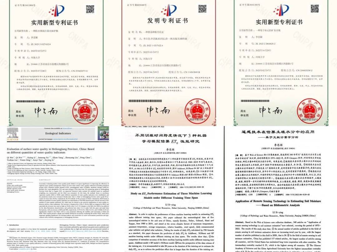 科研上,李思颖同学勤奋创新。她分别主持和参与校级创训一项,以第一作者发表论文2篇,参与发表SCI论文1篇。此外,她还授权2项实用新型专利与1项发明专利。她认为本科阶段积累的科研经验十分重要,希望在未来研究生的生涯中可以继续努力,创造好成绩。