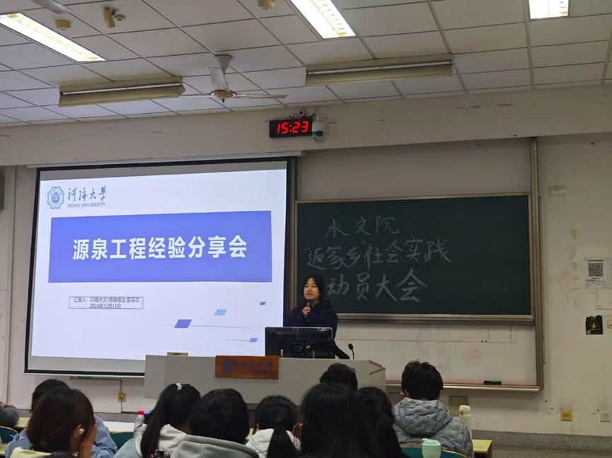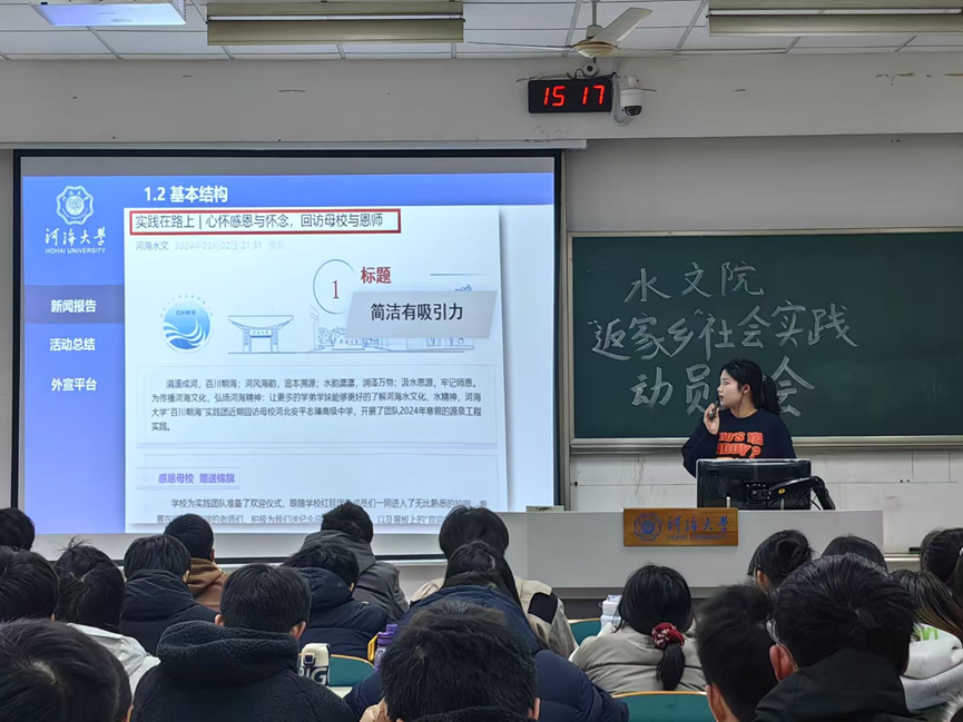 在寒假社会实践动员大会上,林老师向同学们详细介绍了“返家乡”社会实践的丰富内涵,其中,着重介绍了源泉工程,鼓励学生回到生源地,通过多种方式分享国产自拍 的求学经历,传播河海文化,弘扬河海精神,提高学校在中学的影响力。接着林老师就源泉工程的实践流程和实践内容展开了详细介绍,为学生们提供了清晰的指导,并鼓励学生们积极参与社会实践的评奖评优,准备高质量的材料,展示丰富的实践成果。