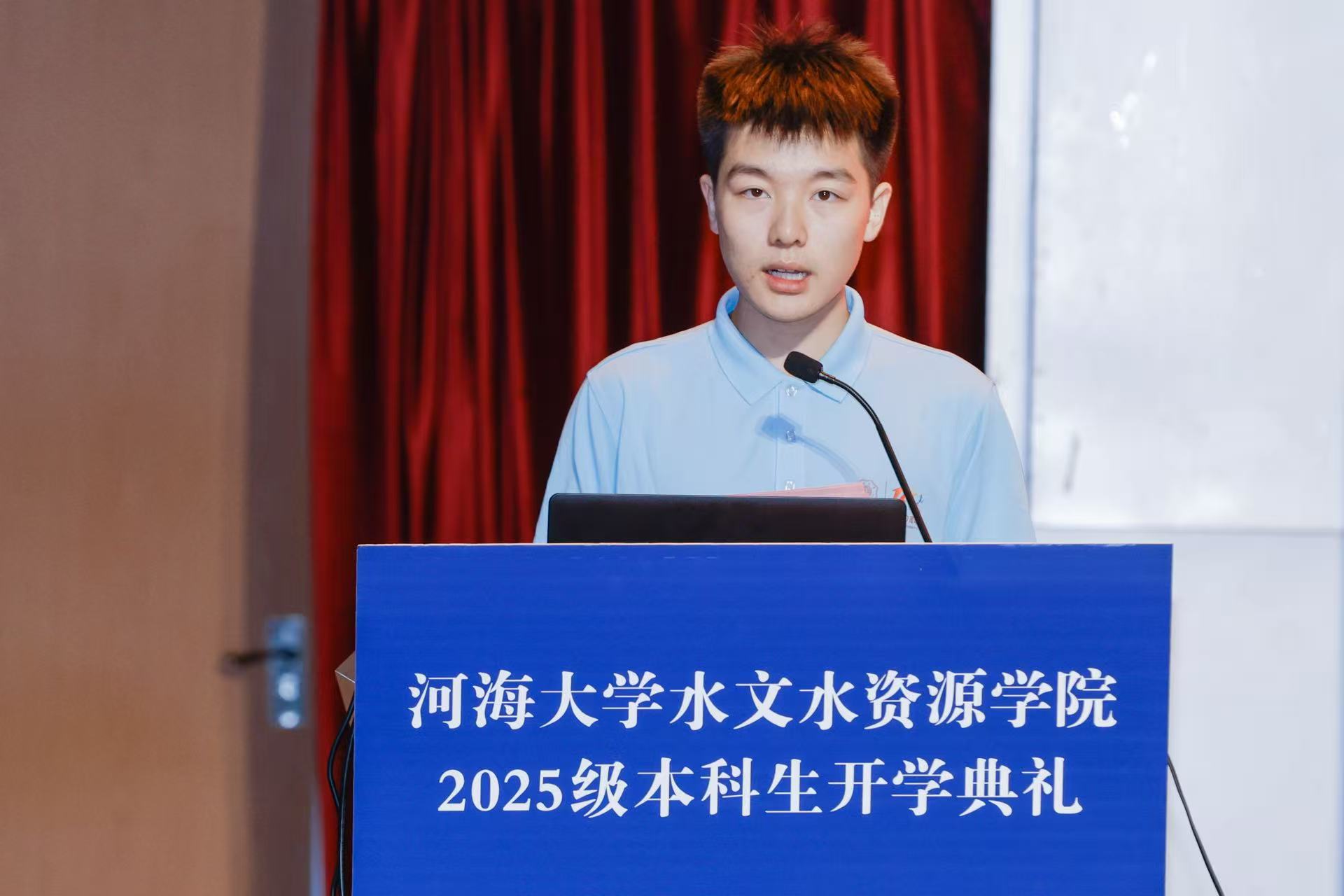 新生代表、2025级水文与水资源工程专业金光耀同学表达了对大学生活的憧憬与决心。他表示将秉承“艰苦朴素、实事求是、严格要求、勇于探索”的河海校训,以师长为榜样,努力成为有理想、敢担当、能吃苦、肯奋斗的新时代青年。
