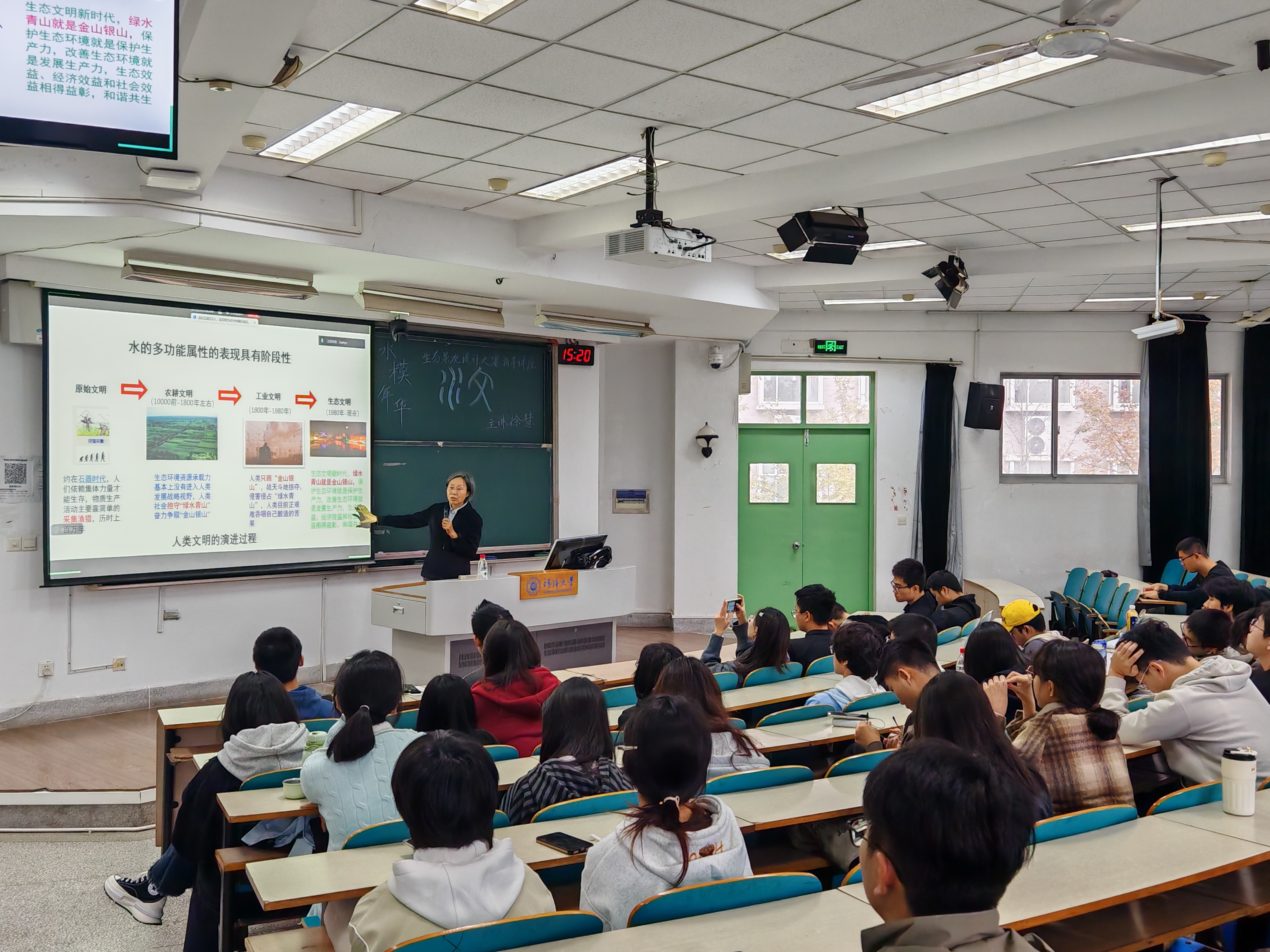 徐老师以“水的多功能属性”为切入点,系统解读水在生态维系、景观营造等五大领域的价值,强调其随社会发展的阶段性特征,并带领同学们梳理从原始文明“依水渔猎”到现代“借水筑景”的水资源利用历程。结合江苏农村幸福河湖建设实践,她以姚港河、吕家桥、木勺塘从“一潭死水”到“水清石秀”的蜕变为例,直观展现水域治理成效,点燃同学们参与热情。同时,徐老师借助河流模型拆解水域规划原理,以南京秦淮幸福河湖为样板解读河湖长制“从主动脉深入毛细血管”的治理效能,并提及雕塑小品、宣传栏等文化载体,为设计拓宽思路。