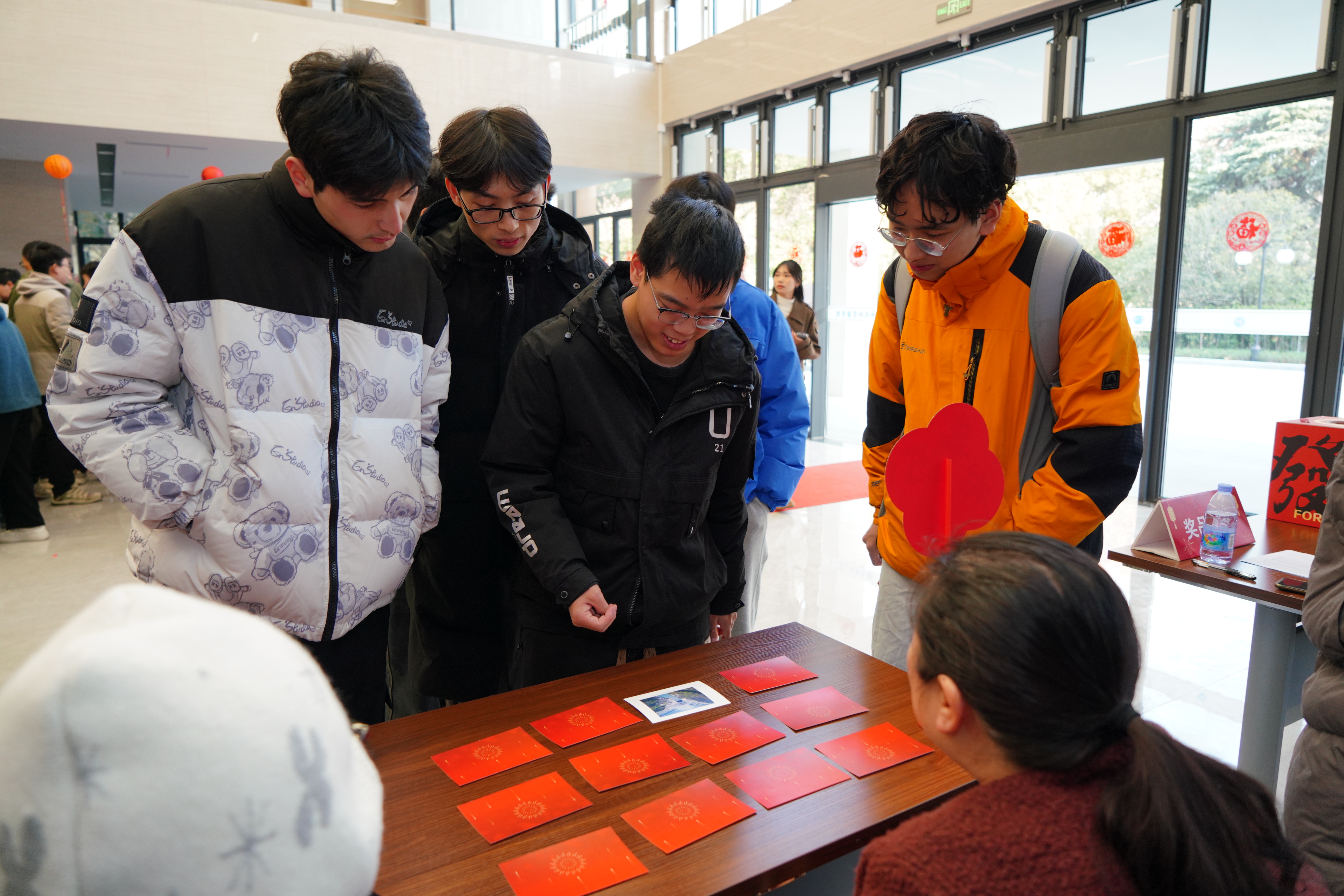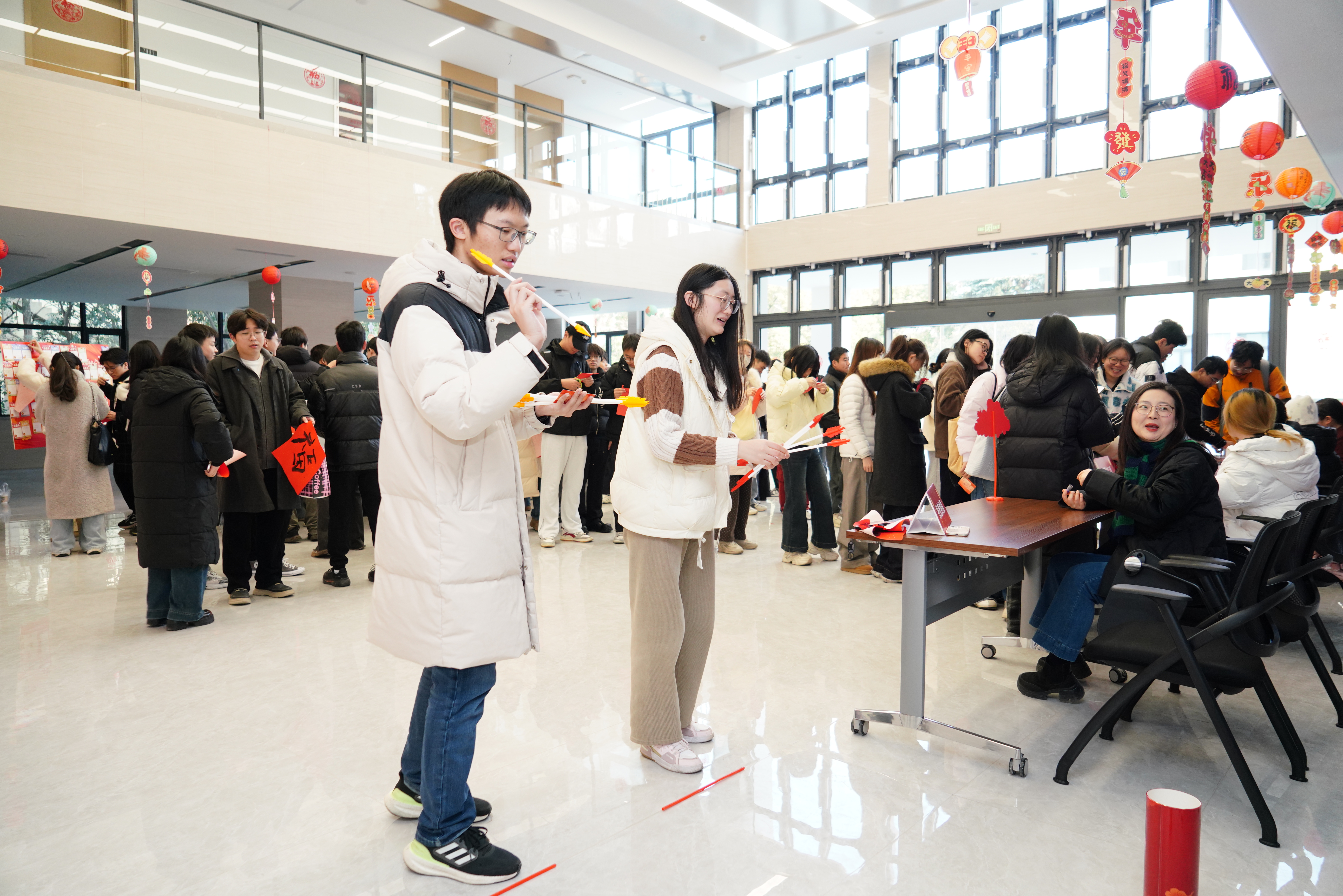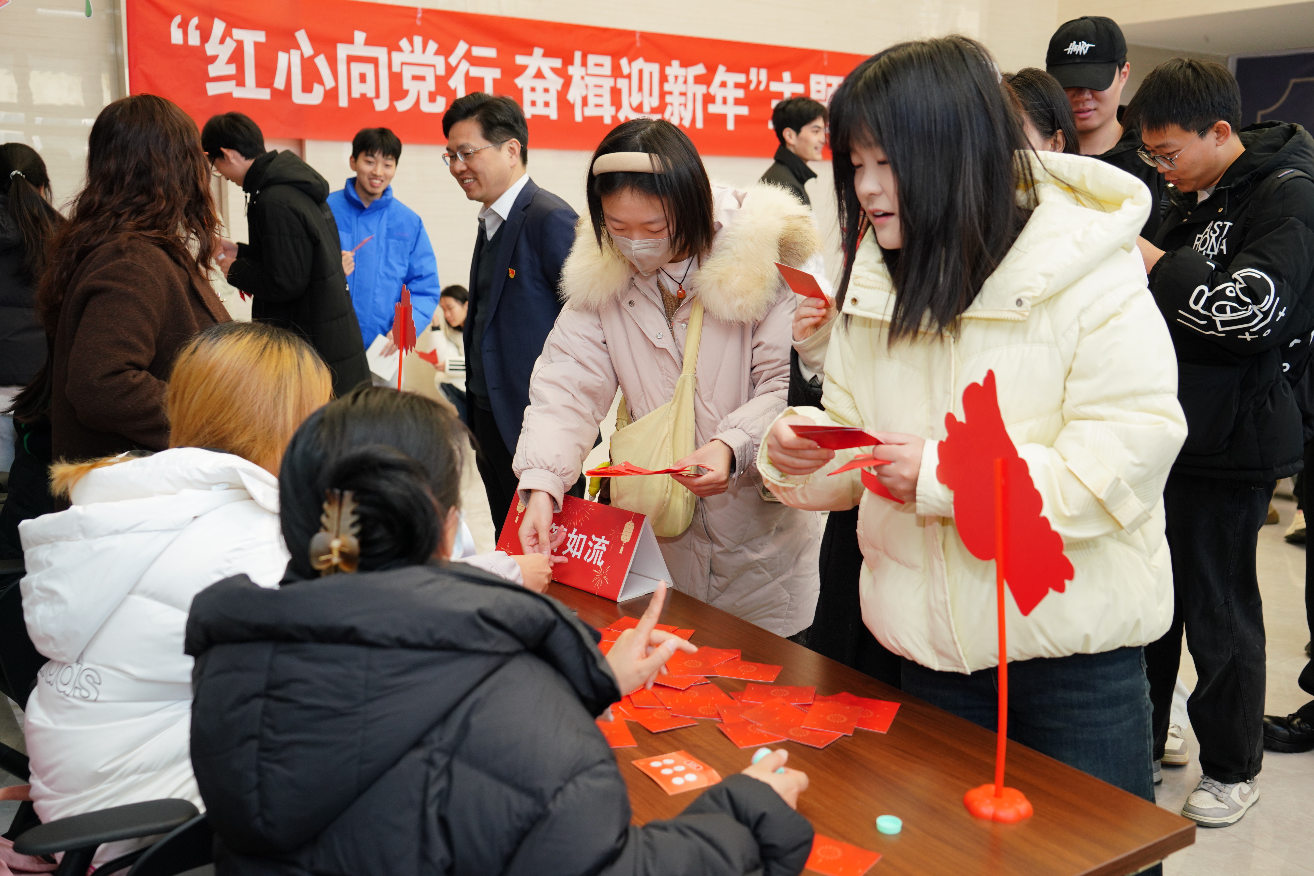 本次活动以新年游园为载体,设置“对答如流”、“红色记忆”、“翰墨迎春”、“投壶纳福”、“巧剪生花”、“新声寄语”六个环节。师生通过知识问答、经典红色场景辨认等形式,强化理论武装,筑牢信仰根基。“翰墨迎春”环节,师生执笔书写春联与“福”字,传递新春祝福;“投壶纳福”与“巧剪生花”则让大家在传统游戏与剪纸艺术中亲身体验中华文化的魅力。现场气氛热烈、年味浓郁,心愿墙上贴满了师生们对过去一年的总结与新年的展望,传递出真挚的期盼与奋进的决心。