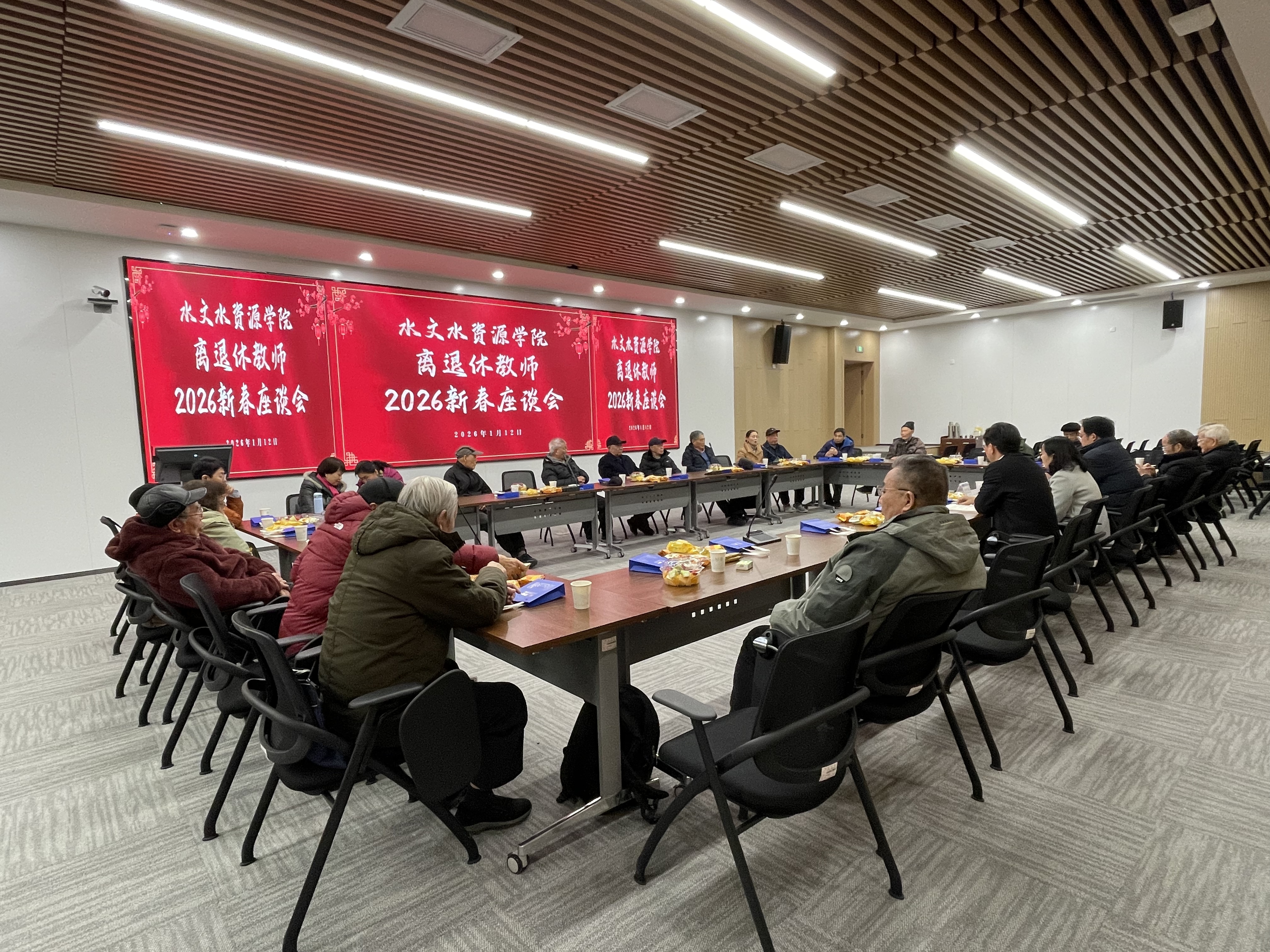 2026年1月12日,西康路校区水文楼内暖意融融,国产自拍 退休教师迎新春活动在此温馨举办。数十位退休教师重返校园,与学院领导齐聚一堂,共忆往昔岁月,共话学院发展。