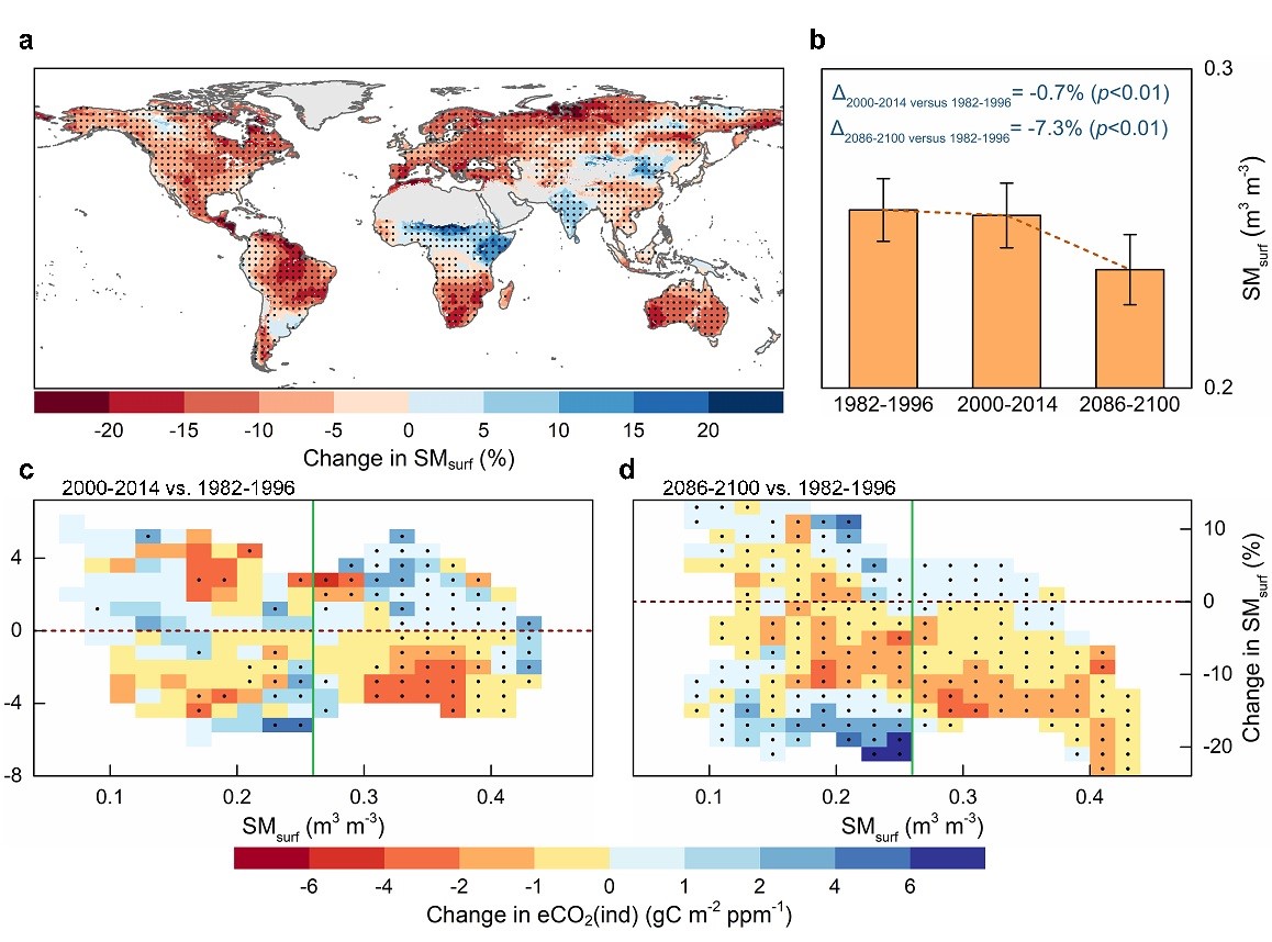研究发现:大气CO2浓度升高引起的气候变化最初可以有效促进植被碳吸收的增长,但这一积极效应在近年来显著下降并在21世纪初转变为消极效应(即导致植被碳吸收的减弱),这种消极效应在未来仍将进一步加剧。CO2间接影响的减弱在北半球高纬度地区尤为明显,并同时伴随着CO2直接生理影响的减弱,可见当前由气候变暖和CO2施肥共同驱动的北方生态系统植被强劲增长态势将会减缓甚至是消失。广泛存在的土壤水分减少是上述CO2间接影响减弱的重要驱动力,除了在一些非湿润地区,干旱带来的水分利用效率增长反而可以缓解植被生长过程中的水分限制从而产生了相反的响应模式。本研究结果有助于更全面地了解全球变化对陆地生态系统的影响机制,以及该系统中碳-水循环间复杂的相互作用关系,从而为更加综合与务实气候缓和战略的制定提供有效参考。