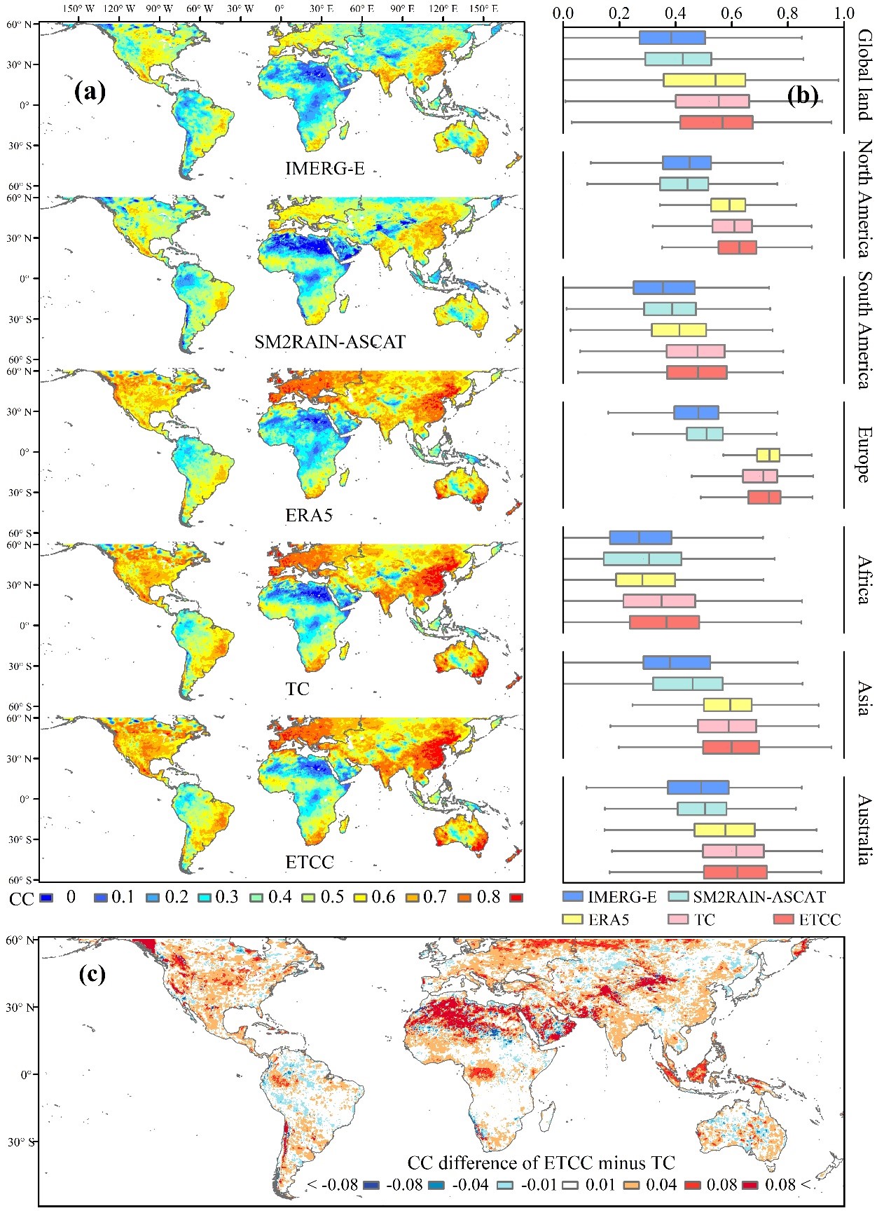 图2 IMERG-E、SM2RAIN-ASCAT、ERA5、TC融合降水和ETCC融合降水分别与CPC在全球大陆的相关系数(CC)空间分布和箱形图