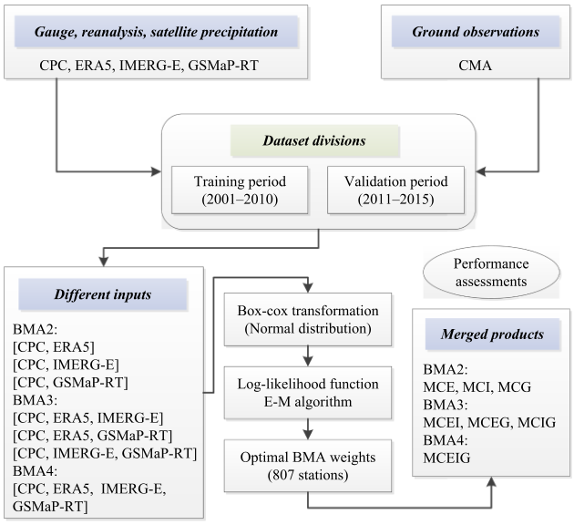 Wei, L., Jiang, S., Dong, J., Ren, L., Liu, Y., Zhang, L., Wang, M., Duan, Z., 2023. Fusion of gauge-based, reanalysis, and satellite precipitation products using Bayesian model averaging approach: Determination of the influence of different input sources. Journal of Hydrology, 618, 129234. //doi.org/10.1016/j.jhydrol.2023.129234